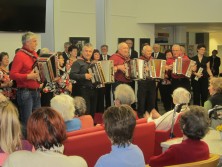 Poleg ubranega petja in pesmi, ki se vedno dotaknejo srca, smo prisluhnili zvokom petih harmonik. Celotno prireditev sta s svojimi hudomušnimi verzi obogatila gospa Tereza Balažič in gospod Maks Starc.