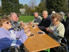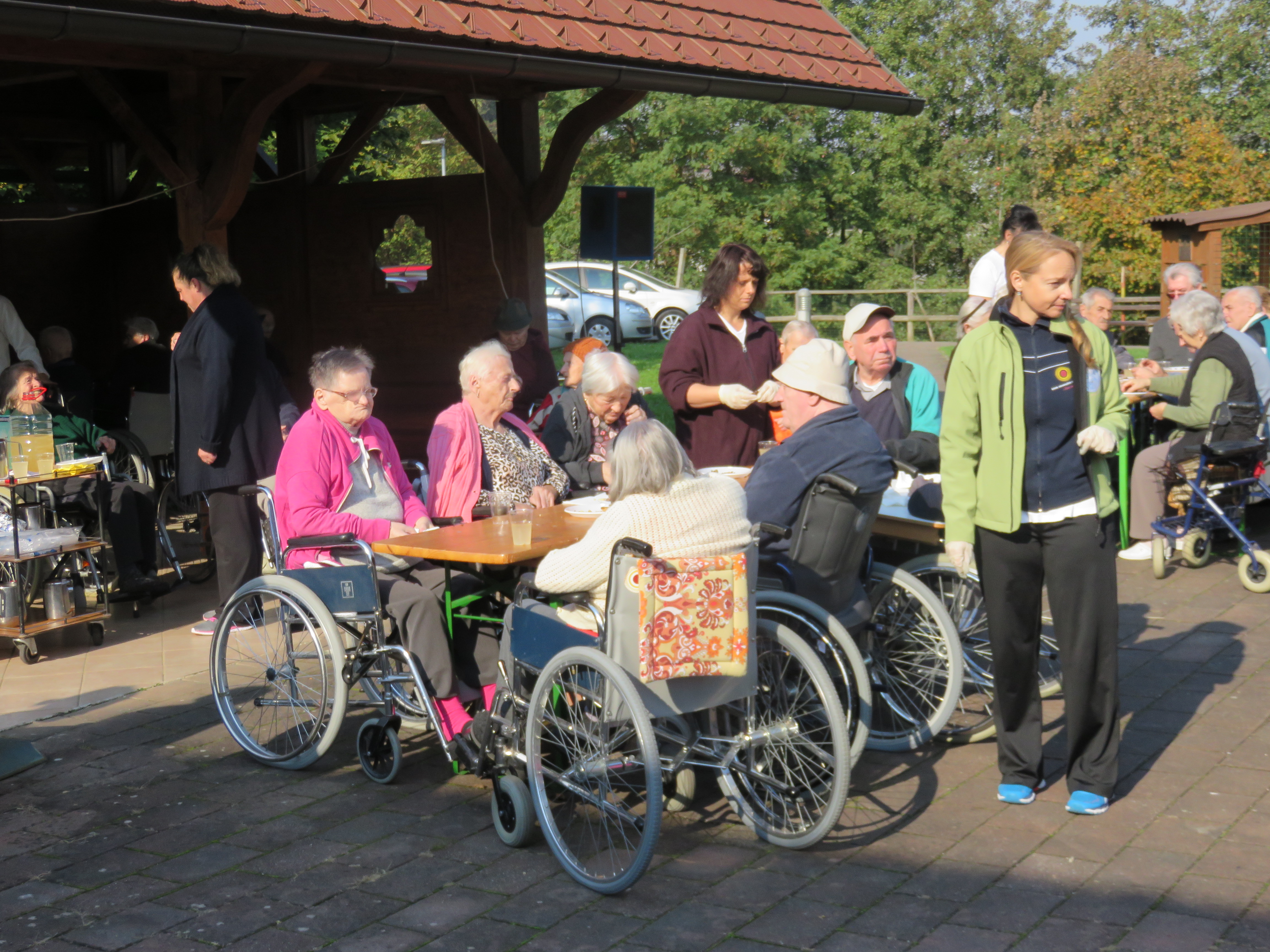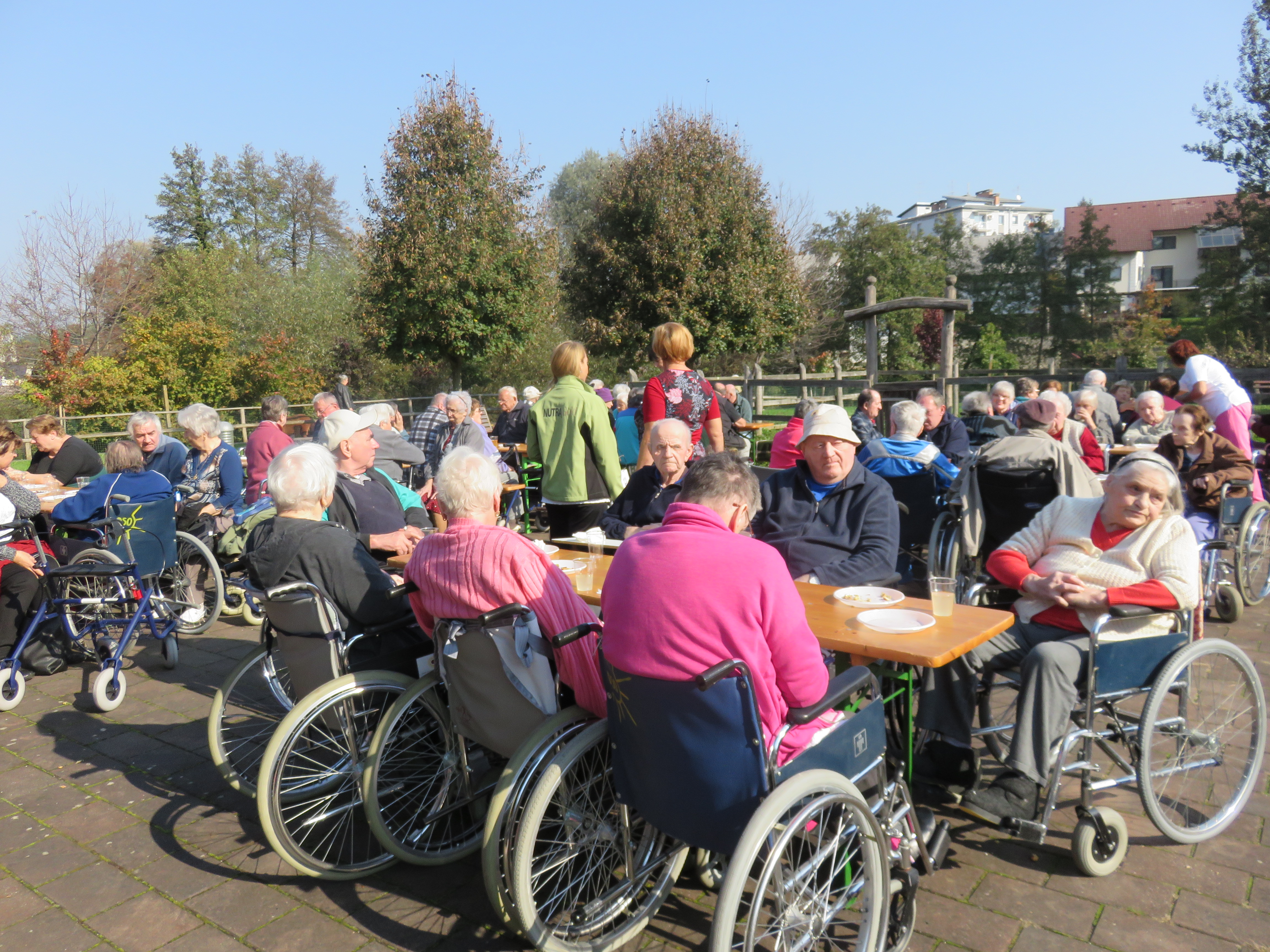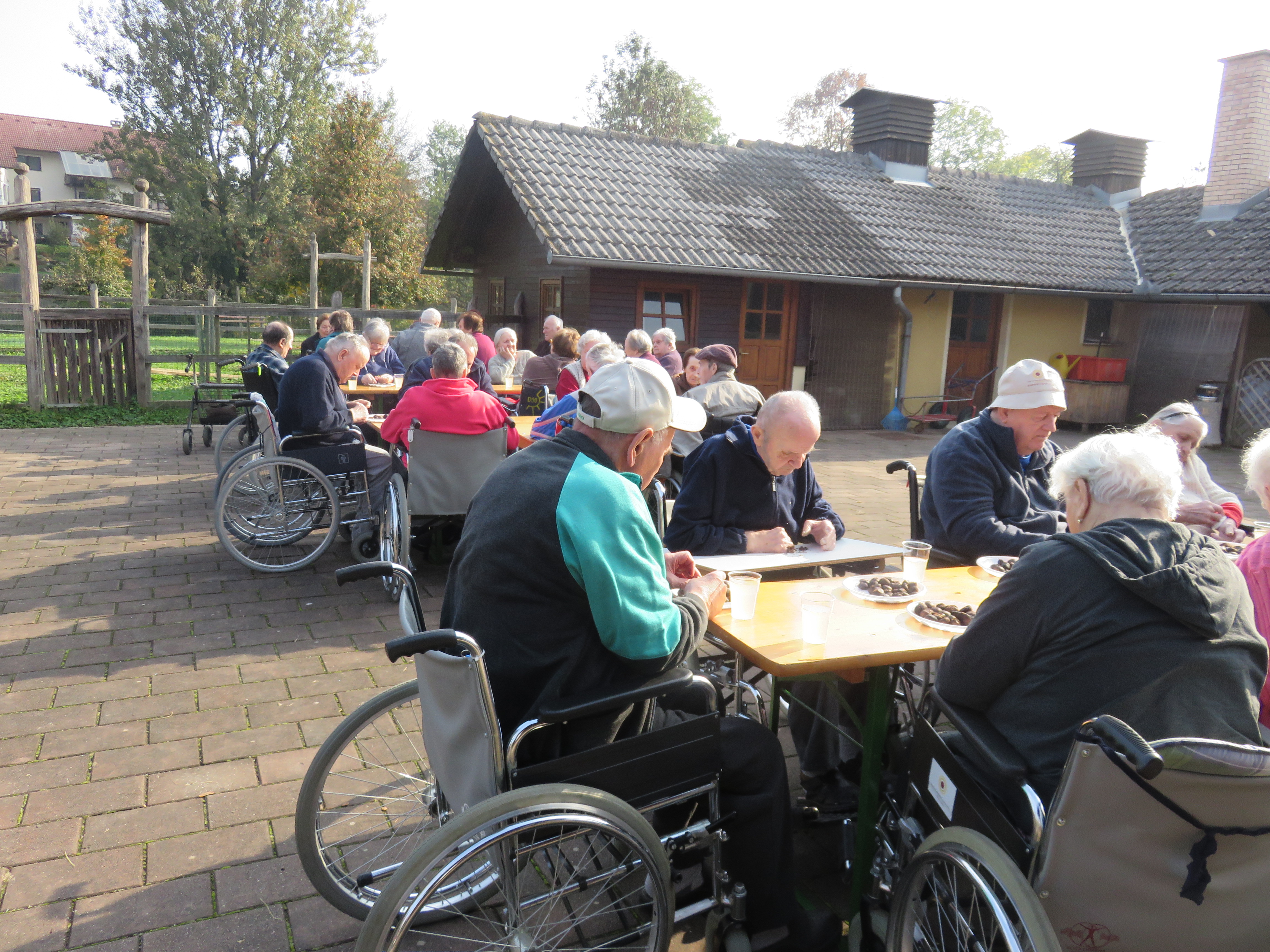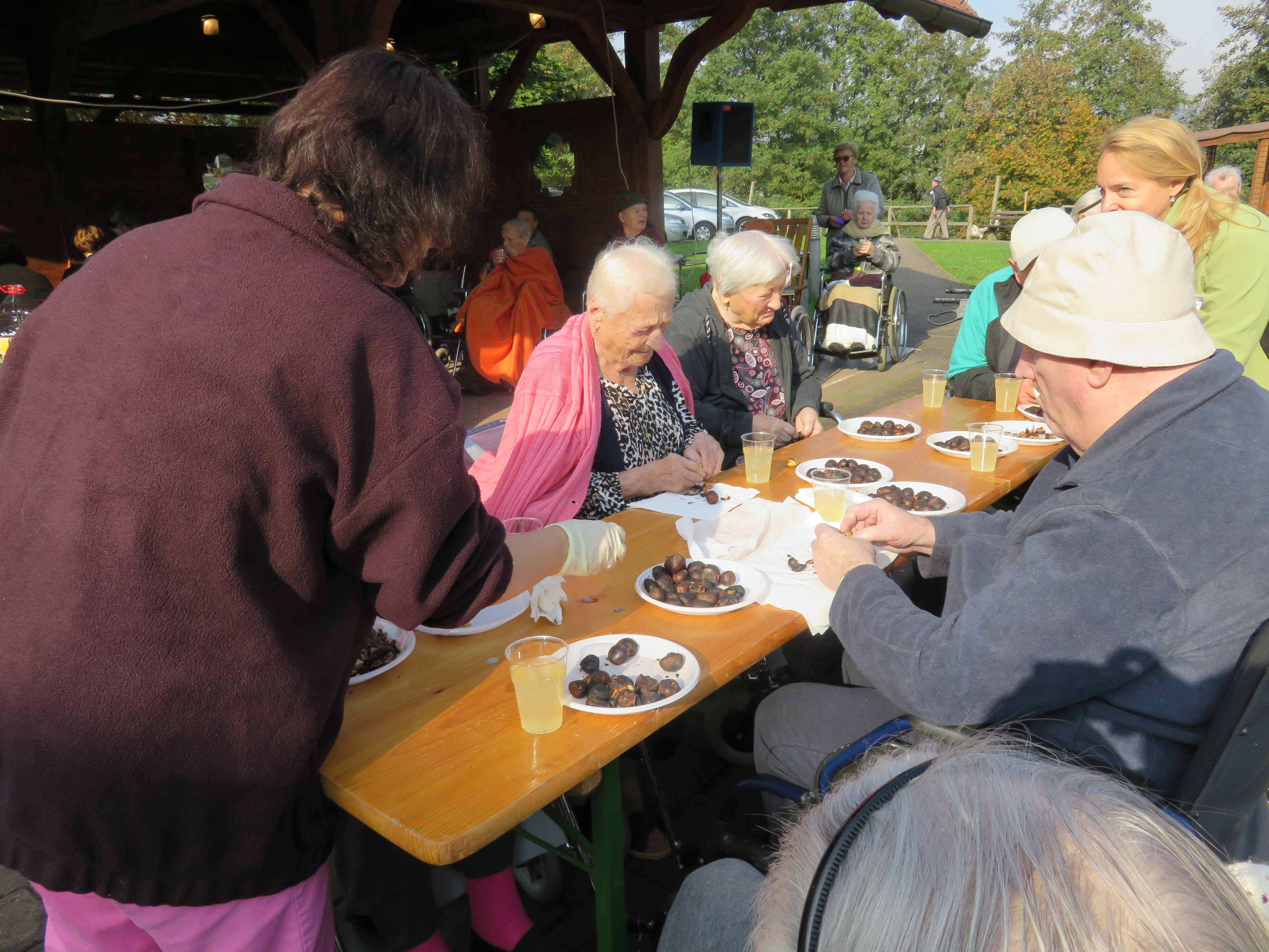 Lepo vreme in vonj pečenega kostanja sta v četrtek, 11.10.2018 premamila stanovalce, da so prišli na Domačijo, kjer smo imeli kostanjev piknik. Tiste, ki niso zmogli priti sami, smo pripeljali na vozičkih, ali pa jih z olupljenim kostanjem obiskali v sobi. Dober vroč kostanj in kozarček mošta sta nas pogrela, poskrbela za prijetno vzdušje in lepo dopoldne na Domačiji.