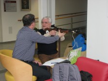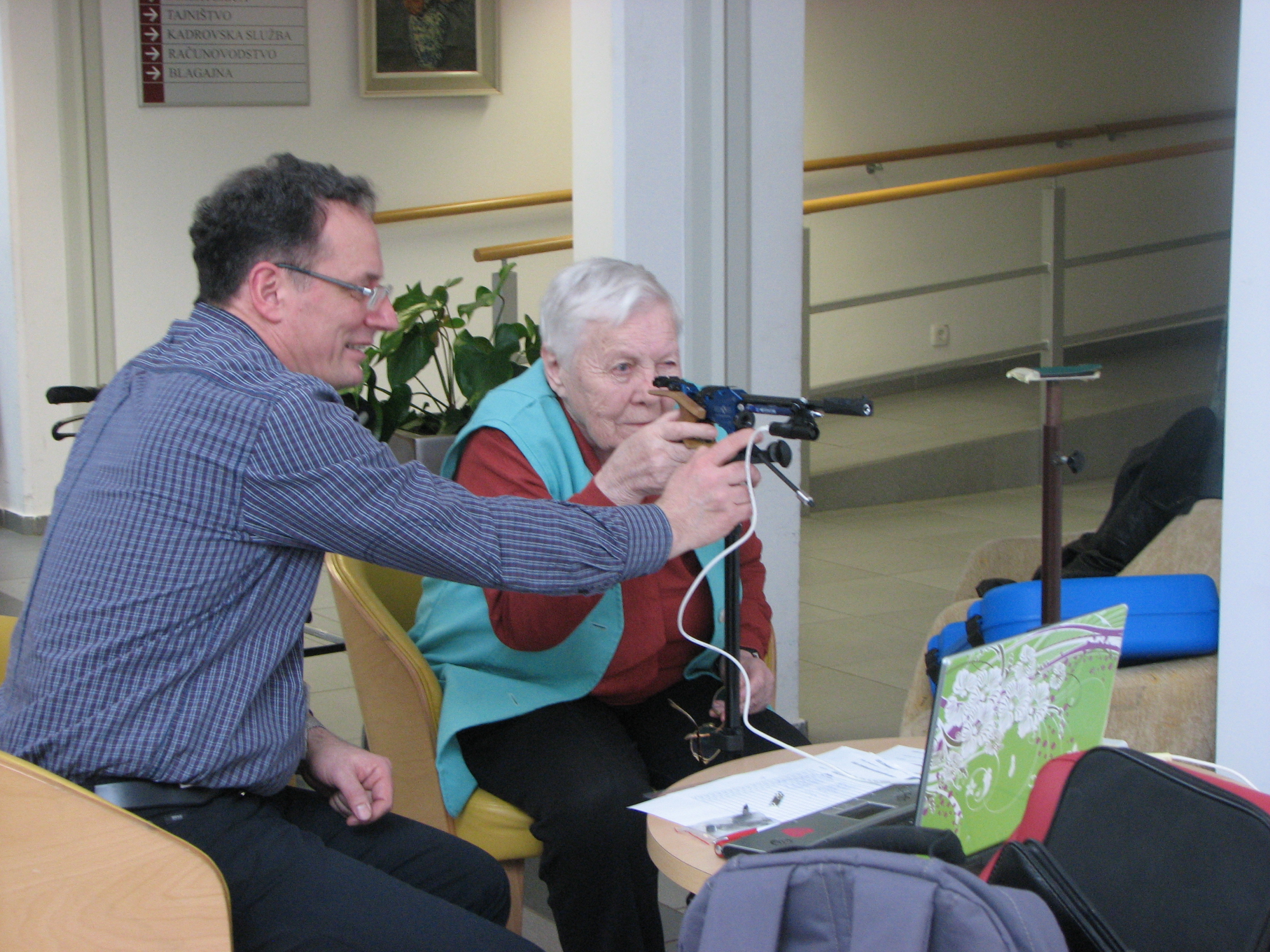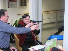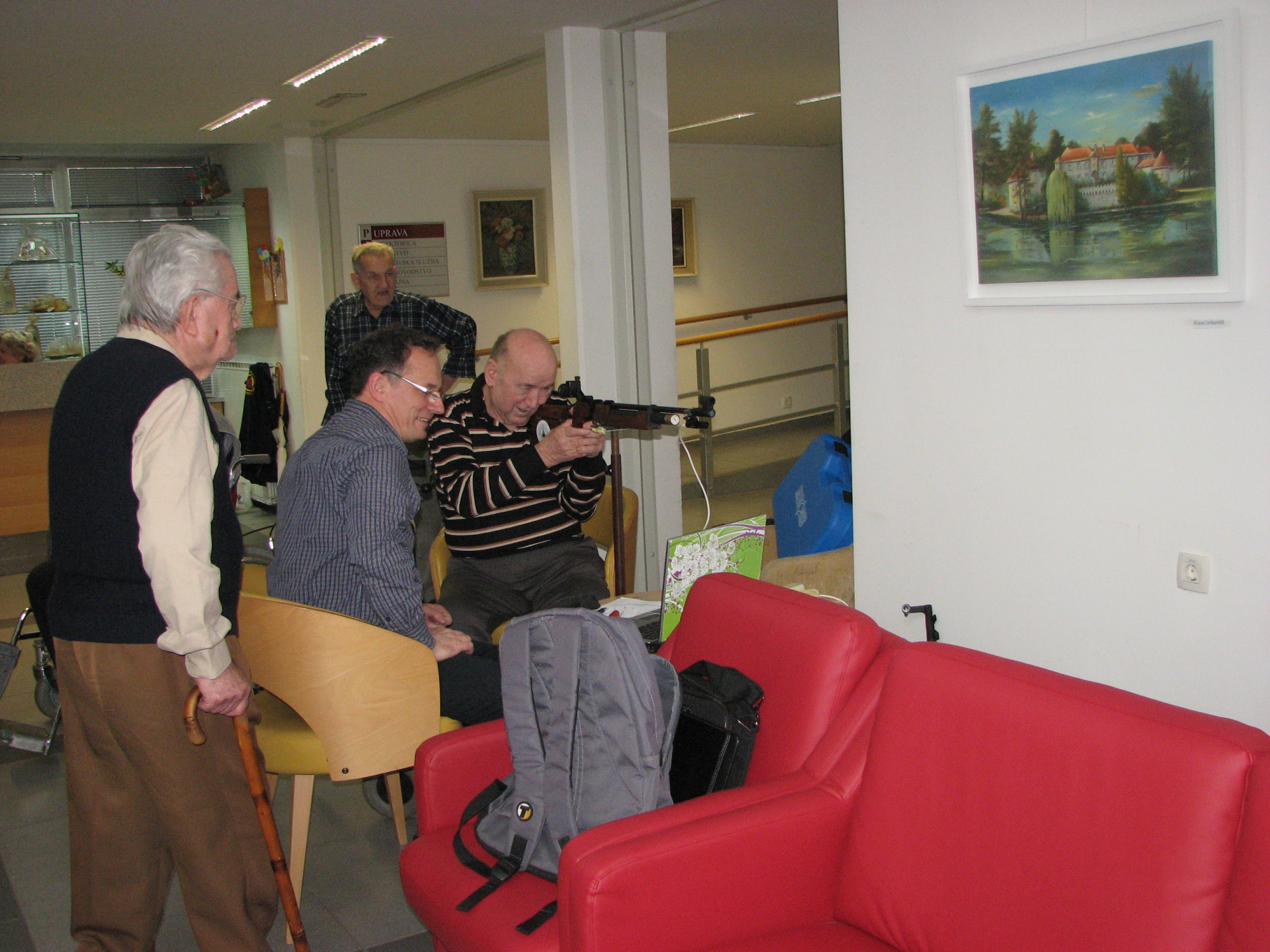 Člani pokroviteljskega odbora KRKA, d.d., Novo mesto se trudijo, da stanovalcem v njihov vsakdanjik prinašajo vedno nove vsebine. Tako je v ponedeljek, 24.3.2014, v naši avli potekal strelski dan. Gospod Darko Malnar, član pokroviteljskega odbora, je skupaj s stanovalci izvedel simulacijo streljanja s pomočjo elektronskega sistema SCATT, ki je v lasti Trim kluba KRKA, d.d.,.V Dom je prinesel vse pripomočke za izvedbo ( tarče, računalnik, puške…). Streljali smo z zračno puško in pištolo. Stanovalcem je nudil podporo, jim dajal navodila in jih spodbujal. Zanimanje za streljanje je bilo veliko, zadetki pa dobri, kljub temu, da roka ni več tako mirna in oko tako ostro kot nekdaj.