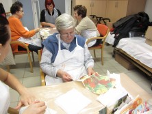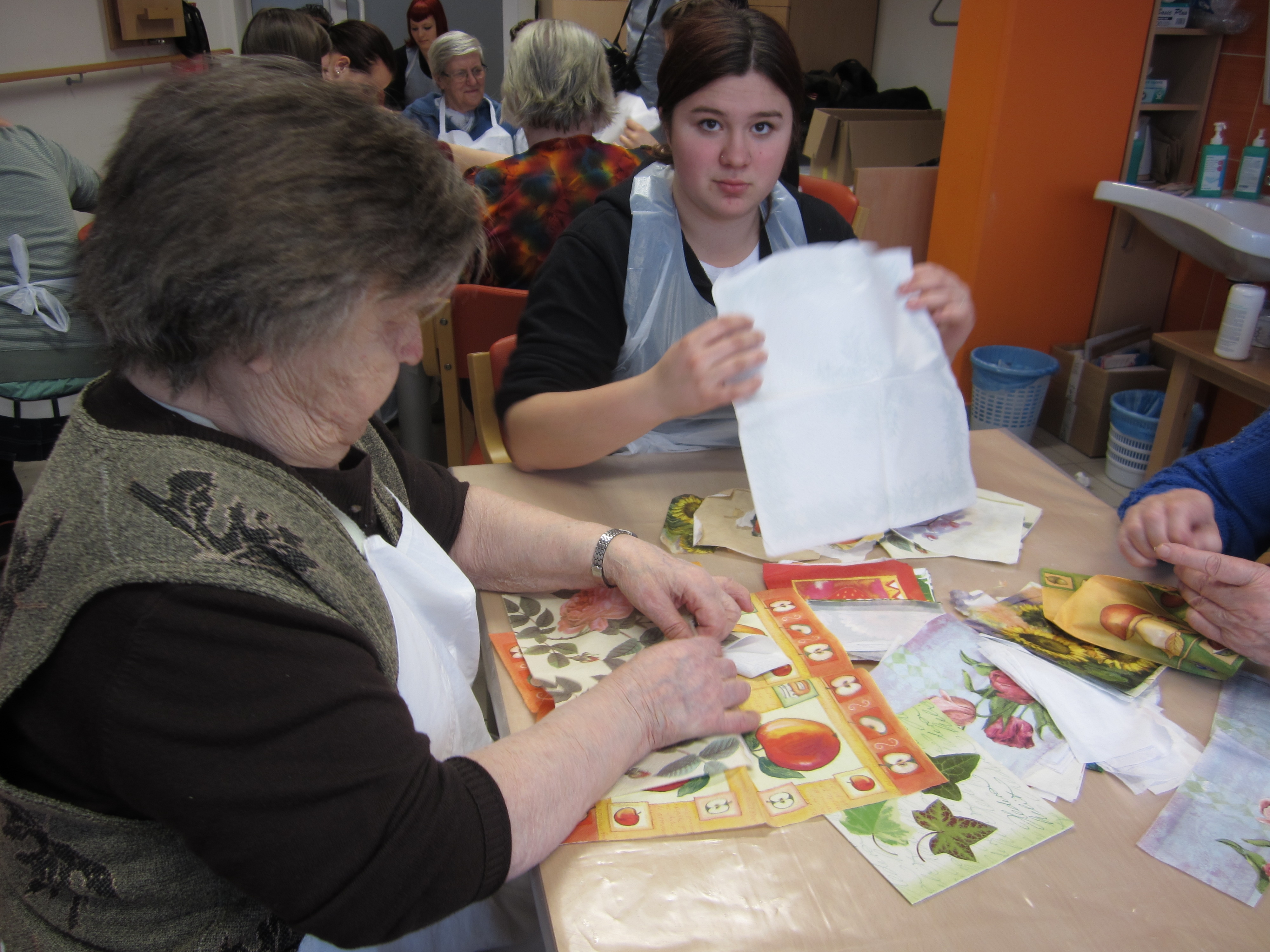 Tudi letos smo v mesecu marcu, skupaj s Srednjo gradbeno in lesarsko šolo Novo mesto v okviru medgeneracijskega sodelovanja izvedli delavnico. Tokrat malo drugače. V vlogi učitelja se je preizkusilo šest stanovalk. Svoje znanje na področju servietne tehnike so uspešno podale sedmim dijakom, ki jih je spremljal učitelj Slavko Mirtič. Tako smo vsi skupaj krepili umske in telesne sposobnosti, hkrati pa zopet ustvarili unikatne in uporabne izdelke. S servietno tehniko smo nadgradili in okrasili lesene pladnje, šatulje in ptičje hiške. Dijaki so tako osvojili ter pridobili nova znanja, stanovalke pa so veliko pridobile tudi na področju samozavesti, koristnosti in potrebnosti. Potrdile so, da še veliko znajo in zmorejo.