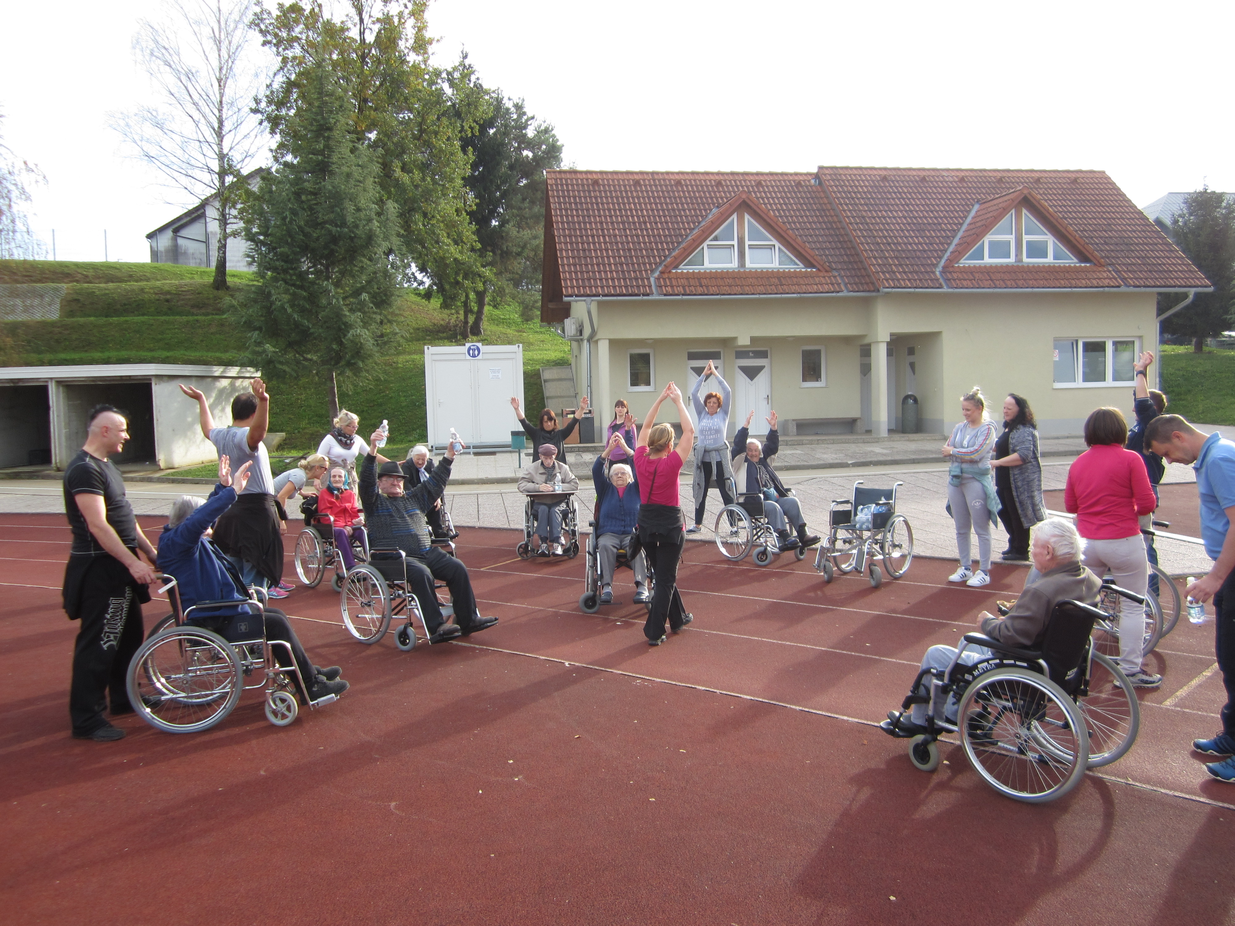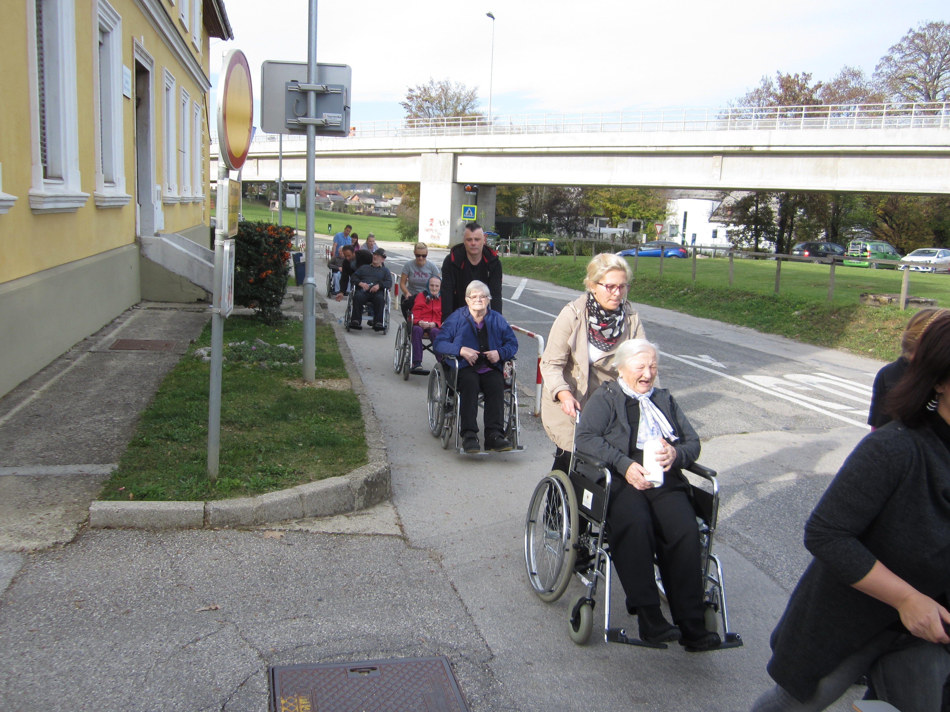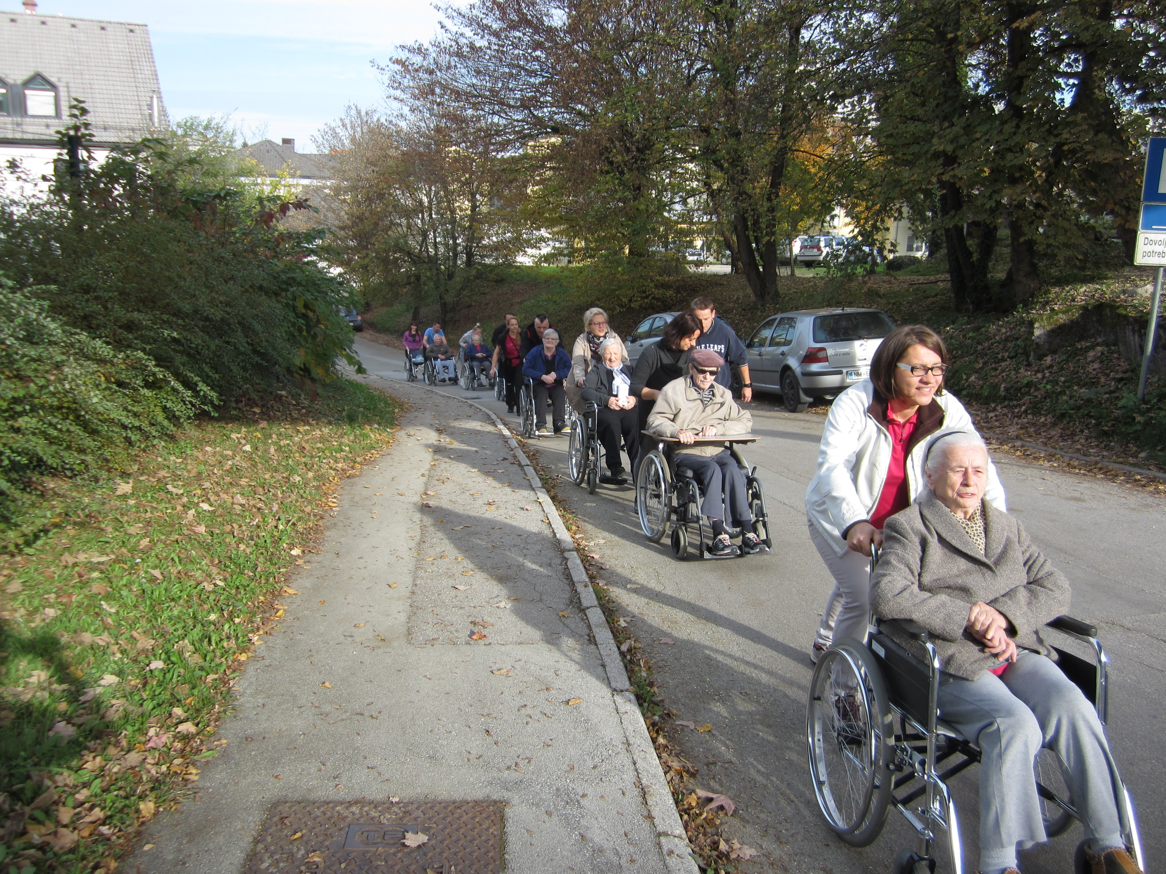 Lepo jesensko vreme nam je 25.10.2018 omogočilo, da smo izvedli sprehod z gibalno oviranimi stanovalci. S pomočjo sedmih prostovoljcev Krka, d.d., Novo mesto in Službe rehabilitacije našega Doma, smo 18 stanovalcev na invalidskih vozičkih odpeljali na sedaj že tradicionalni sprehod v bližnjo okolico. Sprehod je potekal v sproščenem in prijetnem vzdušju. Na polovici poti smo telovadili in se okrepčali s pijačo, nato pa nadaljevali pot proti Domu. Stanovalci so uživali v vožnji in pogledu na okolico. Sklepala so se nova poznanstva in skupaj smo preživeli prijetno popoldne.